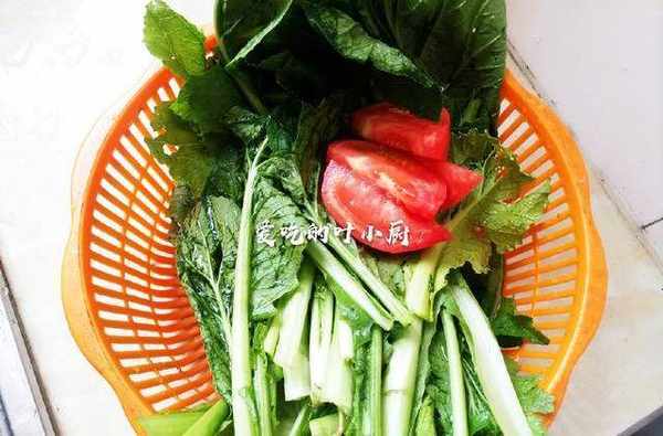 2.食材準備:把小白菜摘去根部洗凈,西紅柿切成塊,根據自己的口味決定西紅柿的用量,大蔥切蔥花。
