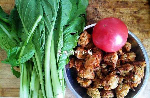 1.所需食材:蘿卜丸子一盤,幾顆小白菜,一個西紅柿,適量的大蔥。