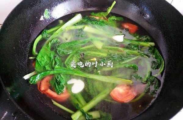 4.等到西紅柿和小白菜炒軟以後,往鍋中倒入適量的清水。