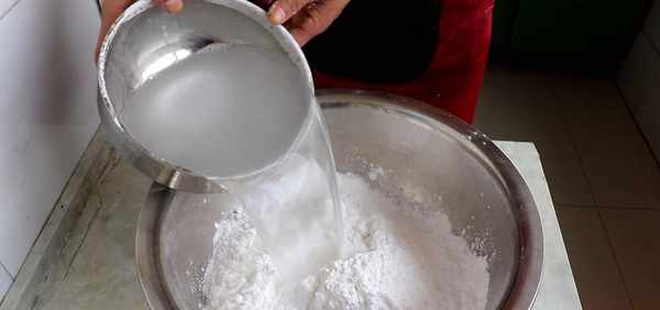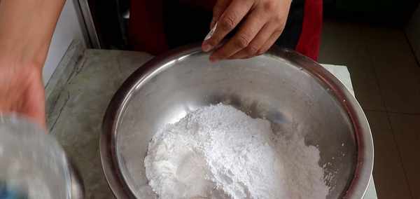 1、首先盆裡加入一碗澄粉,再加入少量的土豆淀粉