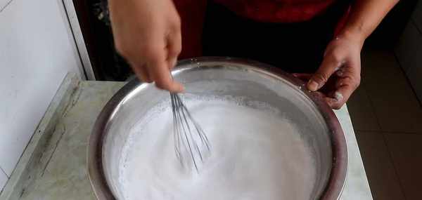 再用同樣大小的碗加入一碗半的水攪成面糊,朝同一個方向不停的攪拌。