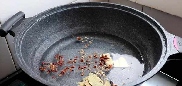 2、下來做個涼皮的調料水,鍋裡加入少量的水,再加入花椒、八角、香葉、小茴香、生薑片。