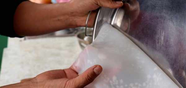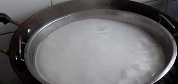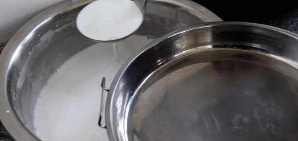3、面糊靜置好後攪一攪,舀一勺面糊倒涼皮鑼鑼裡蕩勻,然後放入開水鍋裡(水的量要多,還要大火燒開)