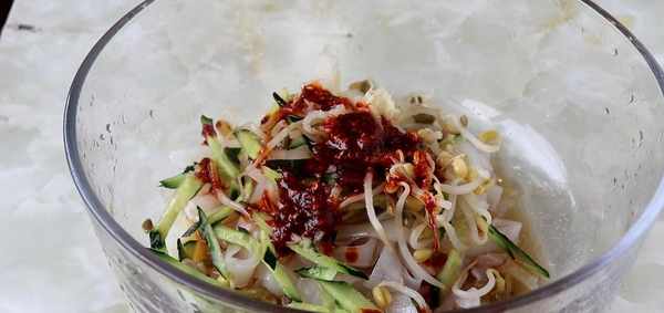碗裡加入黃瓜絲,焯過水的綠豆芽,加入鹽,調料水,香醋水,蒜水。最後加上油潑辣子攪勻就可以開吃啦