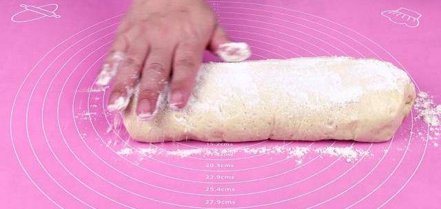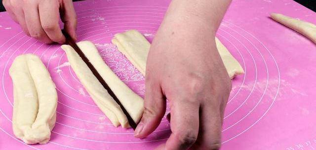 6.我們把醒發好的面移到揉面墊上,撒上一些幹面粉,把發好的面,按壓後搟成長條,再切成2厘米的寬的長,一定不要揉面,揉面的話起筋,炸的時候就不會鼓起來啦。