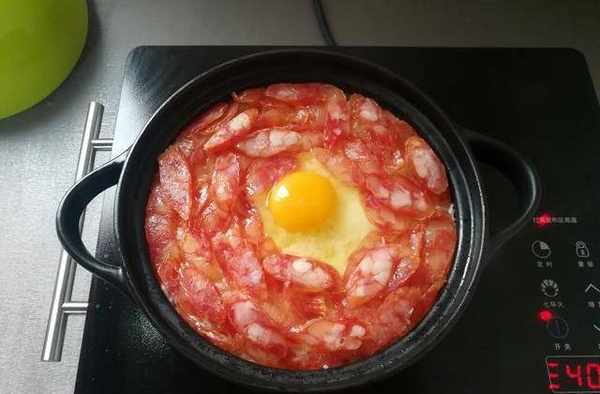 在煮好的米飯上鋪上廣式香腸,中間放上去殼的雞蛋,繼續燜上2分鐘左右。我傢孩子喜歡吃溏心雞蛋,燜2分鐘剛剛好。