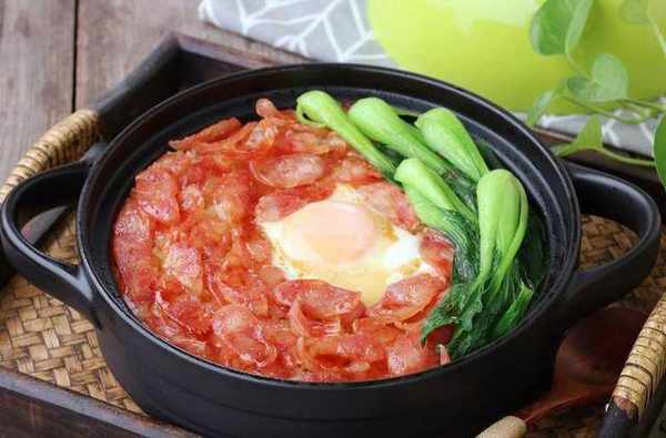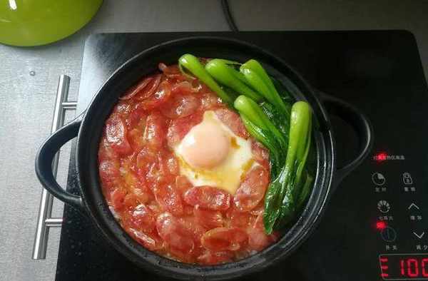 最後把瀝幹水分的上海青放到砂鍋的邊緣,調好的醬汁均勻地淋到雞蛋和香腸上面,一鍋香味撲鼻,好吃又好做的煲仔飯就做好啦。