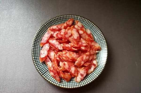廣式香腸斜著切成薄片,廣式香腸是做煲仔飯必不可少的食材,帶有一點點甜味。