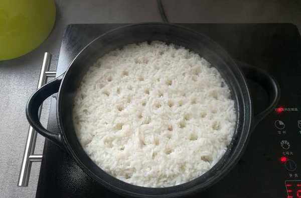 米飯煮好,中間有一個個大洞,這個時候把火源調到中小火加熱,燜上2-3分鐘。