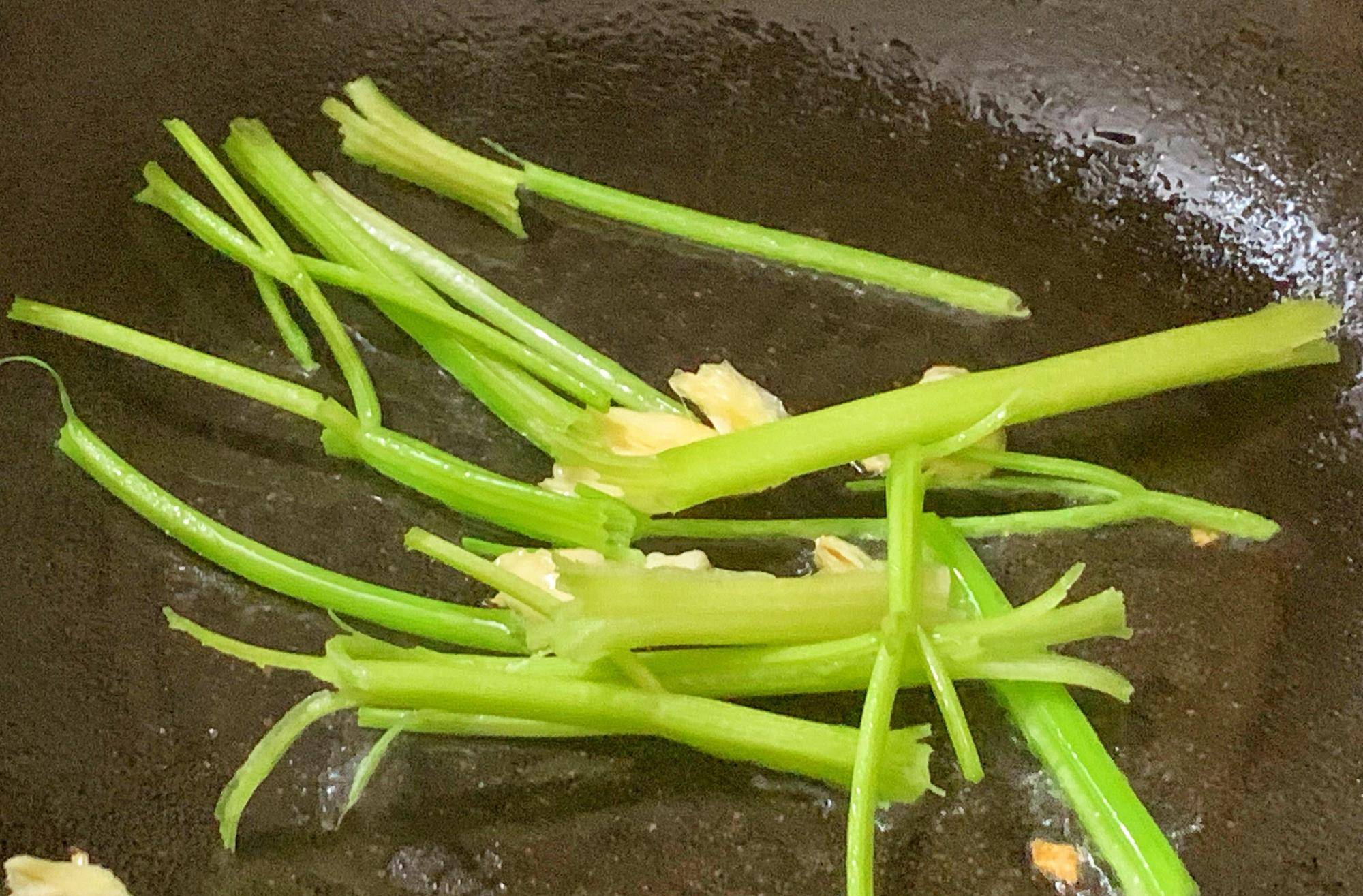 第三步:香芹洗幹凈切成段備用,豌豆撕掉頭尾洗幹凈備用,蒜瓣拍扁去衣備用。倒入雞雜翻炒,鍋裡倒入適量的花生油,油溫燒至七成熱加入蒜瓣爆香,倒入香芹,翻炒至變色。
