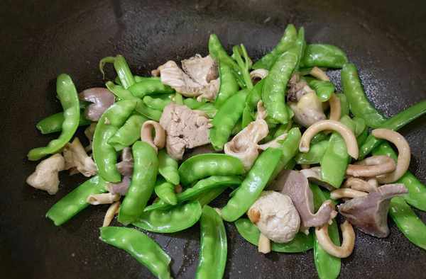 第四步:倒入雞雜,大火翻炒片刻,加入豌豆,繼續翻炒。