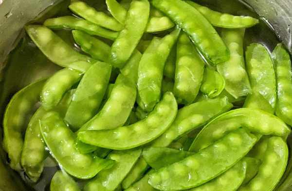 第二步:鍋裡加入適量的清水,大火燒開後倒入豌豆,煮1分鐘去青撈出瀝幹水分。