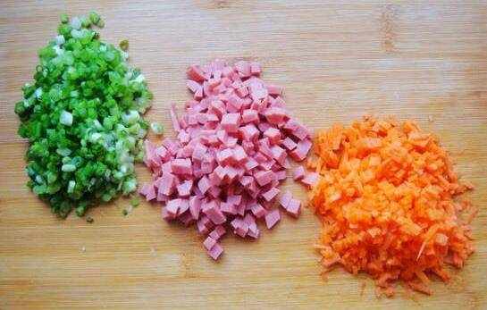 第三步:香蔥、胡蘿卜、香腸切成小塊備用。