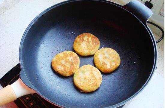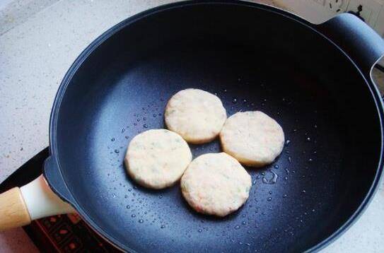第八步:鍋裡倒入少許食用油,把小劑子在手掌裡按扁放入鍋中。