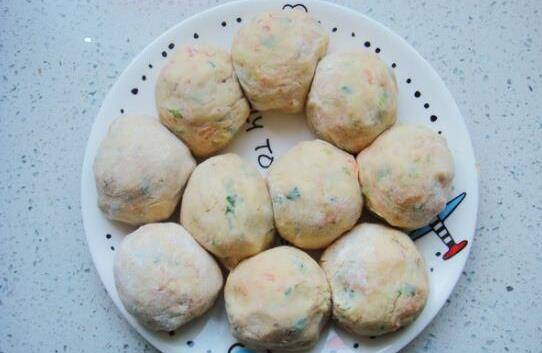材料:土豆420克、胡蘿卜75克、面粉20克、香腸一根、香蔥40克、五香粉10克、辣椒粉5克、鹽少許