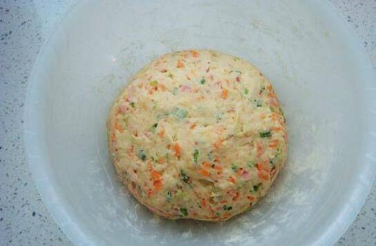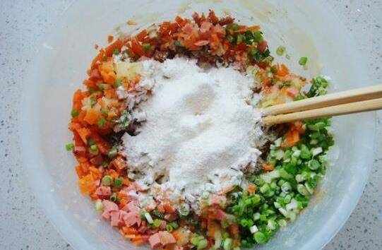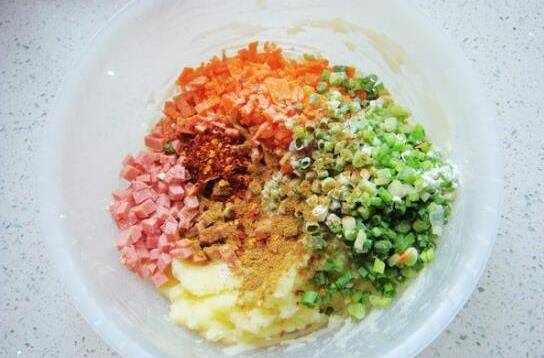 第四步:把切好的輔料放入土豆泥中,加入少許鹽、五香粉、辣椒粉(不喜歡辣的口味可忽略不放)。