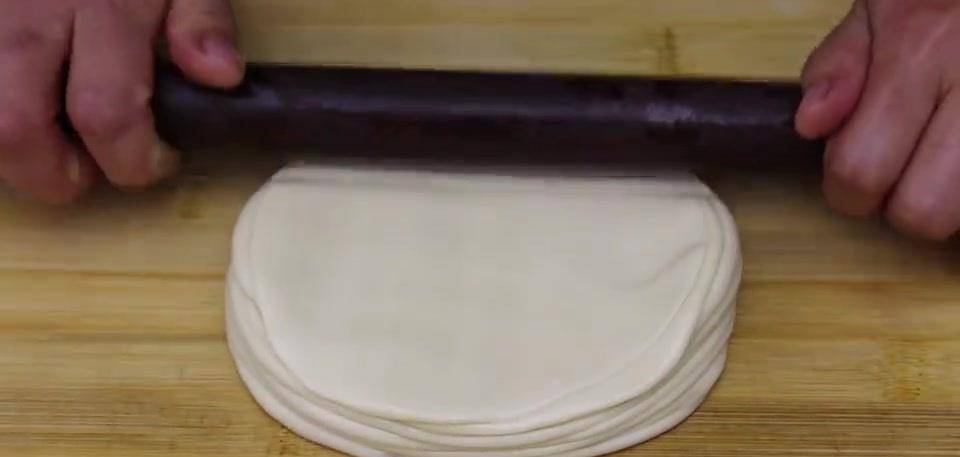 取出一個面劑用手按扁,重疊在一起,全部摞好之後再用手按扁,利用搟面杖輕輕的壓一下,再用搟面杖搟開搟薄,之後在上面倒扣一個圓盤,利用刀沿著盤子的邊緣把多餘的面片拿下來,這樣餅會更好看,把碗邊的面片拿下來再重復這個動作,做成小圓餅。