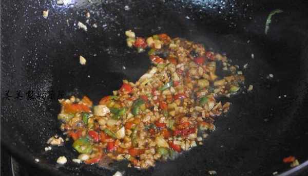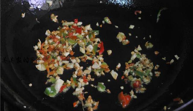 每一個皮蛋切成三段,青紅椒切碎,大蒜切末備用。