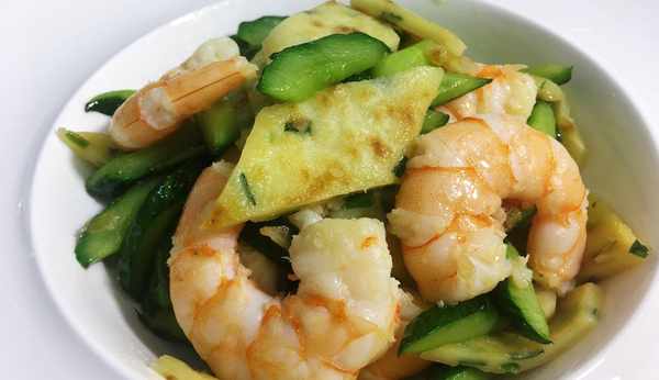 【所需食材】:黃瓜、大蝦、雞蛋餅、蔥蒜、食用油或橄欖油、食鹽、雞汁