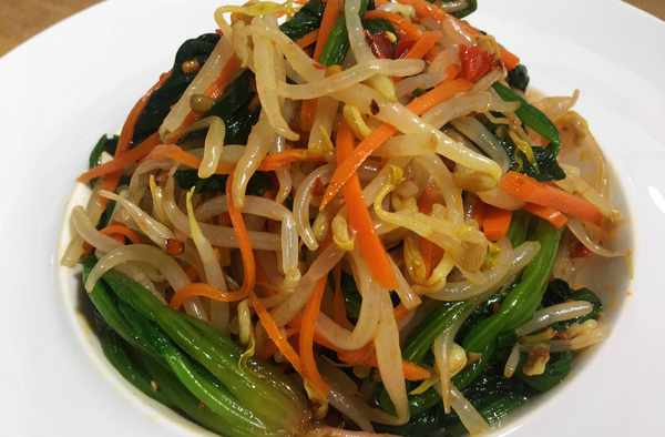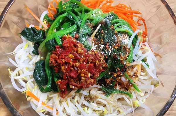 【所需食材】:菠菜、綠豆芽、胡蘿卜、生抽、食鹽、涼拌醋、雞精、香油、油潑辣子、蒜蓉辣醬、辣鮮露