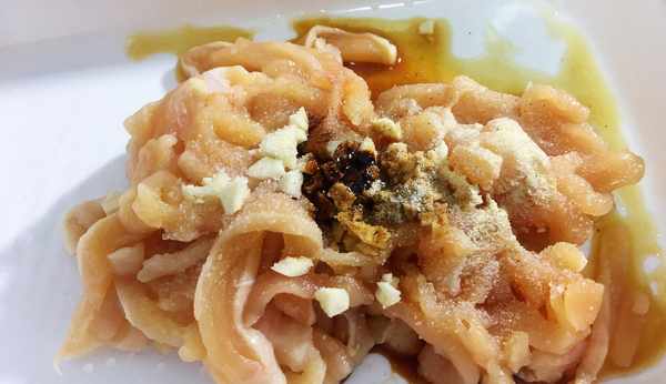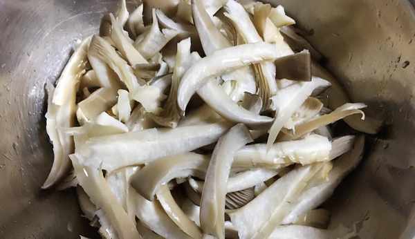 ②:浸泡好後,用流水仔細地把蘑菇的背面縫隙裡的雜質等沖洗幹凈,正面也用手搓洗一下,最後撕成均等粗細的條。