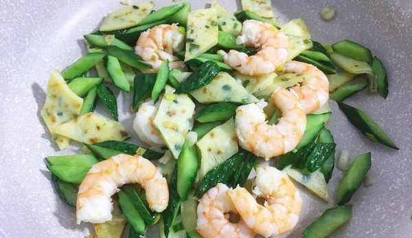 ⑥:鍋中少倒一些食用油或橄欖油,油熱後,放入切好的蔥蒜,炒出香味後,依次放入黃瓜、蝦仁和雞蛋餅。
