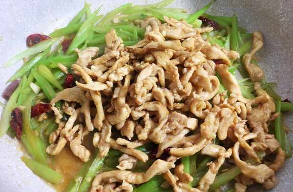 ⑥:放入適量的生抽、食鹽、十三香、花椒粉和雞汁,翻炒均勻,炒至芹菜斷生後,放入炒好的雞胸肉。