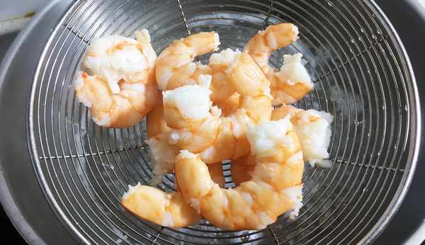⑤:可以把黃瓜和蝦仁先都焯一下水,鍋中水開後,先放入黃瓜,焯水30秒即可,撈出到涼水盆裡再瀝幹水分,最後放入醃好的蝦仁,焯至蝦仁斷生變色後,盛出備用。