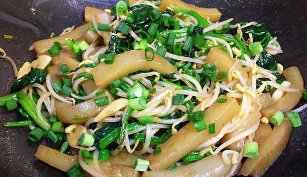 ④:鍋中倒入少量的食用油或橄欖油,油熱後,放入切好的蔥段和蒜片,炒出香味後,放入魔芋。