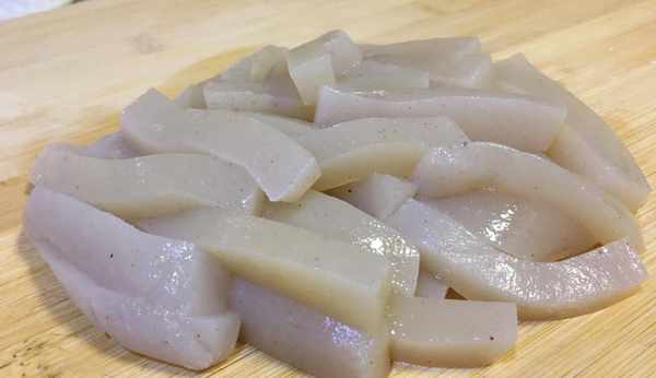 ①:把魔芋沖洗幹凈後,先切成厚片,再切成粗條,全部切好後,放入開水鍋裡,焯水2分鐘,焯好後撈出到涼水盆裡浸泡一會兒,再用流水多沖洗幾遍,瀝幹水分備用。