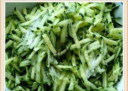 【第一步】:首先我們準備兩根黃瓜,大約有500克左右,黃瓜洗幹凈之後直接擦成細絲放入碗中,往碗裡放入一勺鹽,用手抓拌均勻,把黃瓜裡的水分殺一些出來,大約用手抓拌一分鐘就可以瞭,然後用力攥幹黃瓜中的水分,大碗中剩餘的黃瓜汁不要倒掉瞭,我們接下來需要用它來和面,