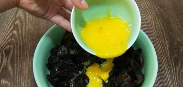 2、再準備2個笨雞蛋,打散淋在木耳上,用筷子攪拌均勻