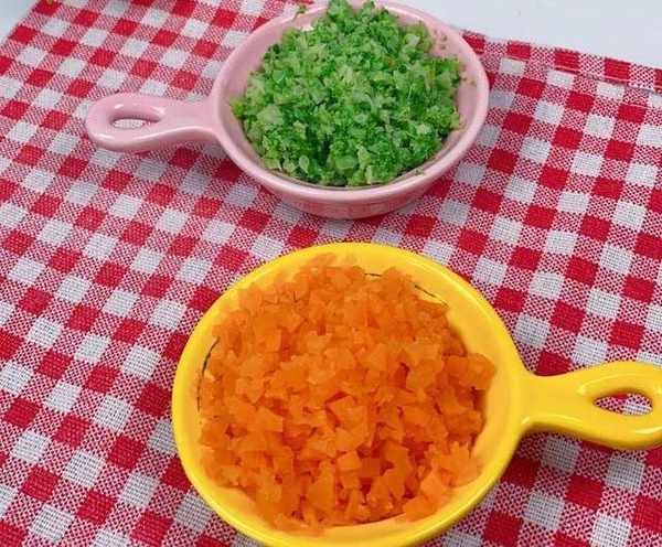 3.再把焯好的胡蘿卜和西蘭花切碎裝到碗裡備用。