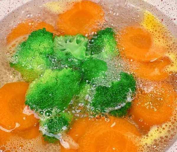 2.把買回來的西蘭花和胡蘿卜洗幹凈切薄片,鍋中水開下鍋焯燙一會,焯好撈出。