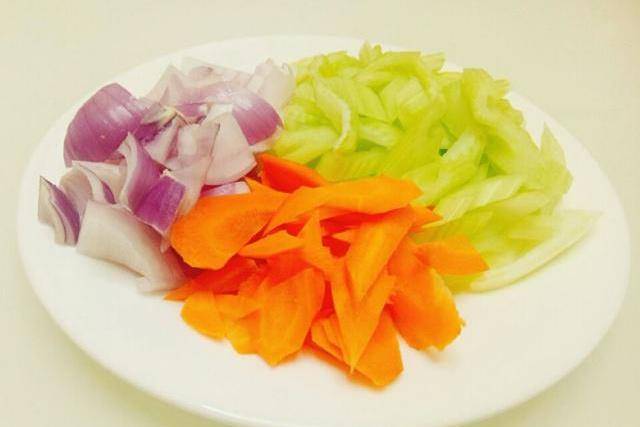 2.芹菜,胡蘿卜,洋蔥清洗幹凈,將芹菜的筋葉削去,然後斜著切成滾刀塊;芹菜一定要去筋,去筋的以後又脆又嫩,吃起來口感很好;