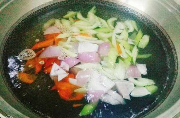 5.鍋中加水燒開,下入芹菜,撒點食鹽,植物油,焯水一分鐘後下入洋蔥和胡蘿卜,再次水開之後一起撈上來;洋蔥焯水可以去除辣味,口感也會變得更加柔和;