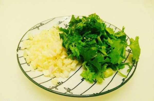 8.撈出花椒扔掉,把熱油澆在碗中的蒜末上;在上面放上香菜段。