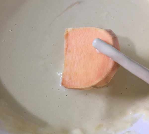 地瓜盒的做法並不復雜,切片掛上面糊炸就可以瞭,如果想讓它更甜蜜點還可以夾上紅糖再炸。