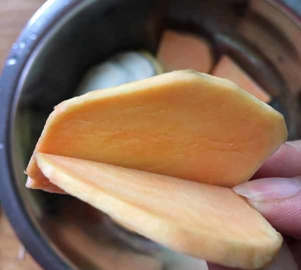1,地瓜削皮後切成片,兩片中間不要切斷。
