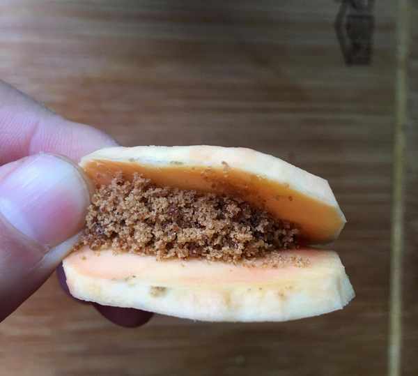 3,兩片地瓜中間夾點紅糖,(紅糖裡最好混一些面粉,這樣炸出來後糖漿會濃稠,不易漏出)