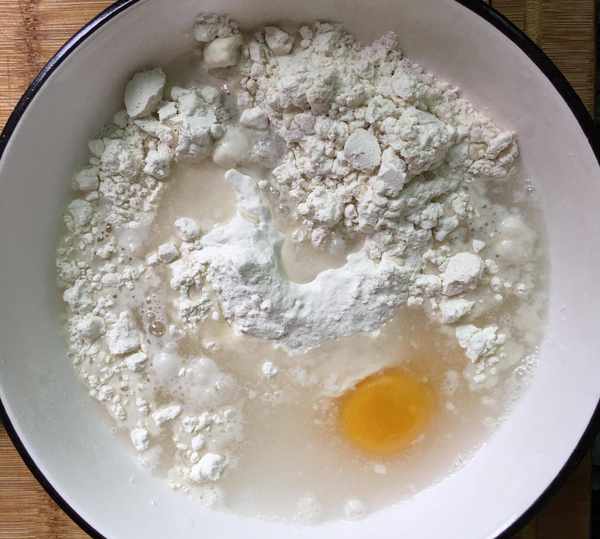 2,取適量面粉,打入1個雞蛋,加適量水攪拌成不稠不稀的面糊。
