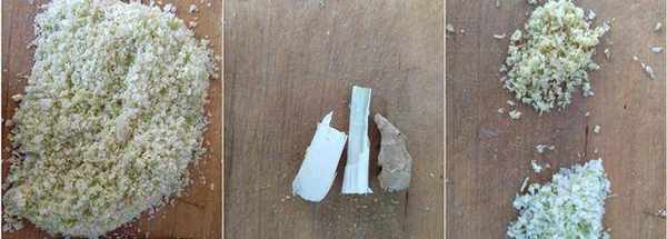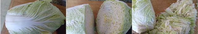 2把一棵白菜從菜幫和葉子中間切開,用葉子,把菜葉剁成碎粒備用。(用葉子剁碎不會出水)