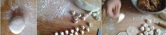 7將搟好的面皮,放點調好的白菜肉餡,包在裡面兩邊一捏,用兩隻手的拇指和食指對起一箍,包成餃子。