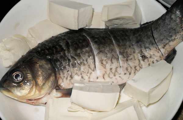 3. 接下來需要在鍋裡面加入適量的熱水,這個水一定要稍微多一些,因為魚湯在燉煮的過程中水是慢慢的變少的,而且是要開大火,把湯汁煮得濃白的時候在裡面加入已經切好的豆腐塊繼續燉煮30分鐘的時間,那麼這樣一道特別美味的魚湯就做好瞭。