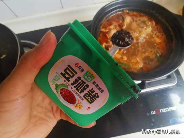 第四步:加入甜辣醬再加入少許水,然後舀上一大勺葱伴侶豆瓣醬,上色提味,這樣做出的菜肴會有很香的醬香味道。