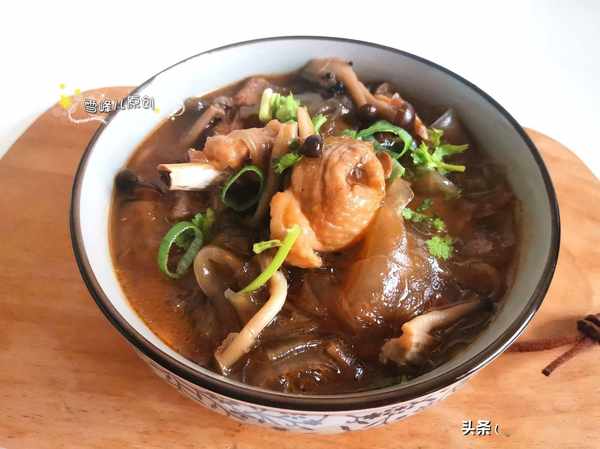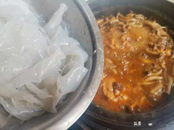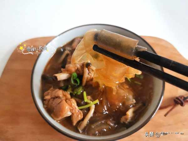 第六步:再加入粉皮繼續燉5分鐘。粉皮是紅薯粉皮最好,筋道不粘,燉雞燉排骨都很棒。