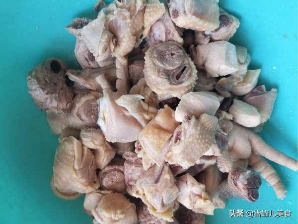 第二步:小雞剁成小塊,鍋裏放水,放入雞塊焯水撈出,洗淨備用。雞肉含蛋白質較高,很容易被身體吸收入利用,有增强體力,強壯身體的作用。自家養的小雞不但味道好,營養也更好。