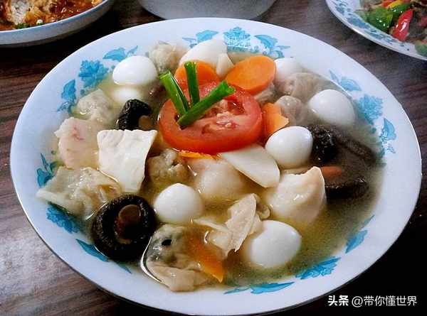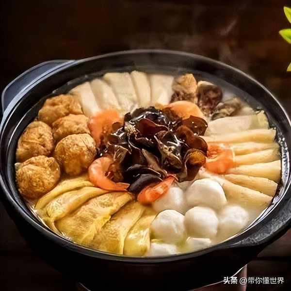 全傢福,從名字就可以知道,這道菜的食材品類很多,主要有肉丸、蛋卷、蛋餃、冬筍片、肉片、香菇……,講究點的還有海參、魷魚,幾乎涵蓋瞭長沙人習慣吃的所有食材,五彩紛呈,熱氣騰騰......