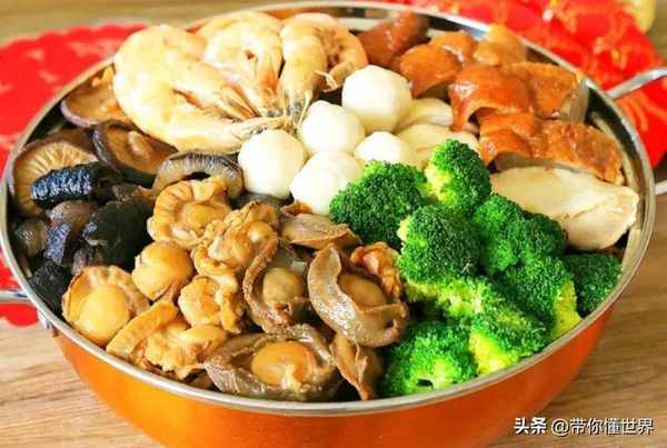 盆菜類似於雜燴菜式,在珠海等地,是過年必備的一項,寓意著“盆滿缽滿”。