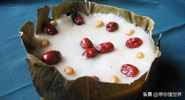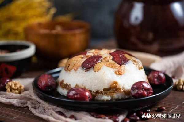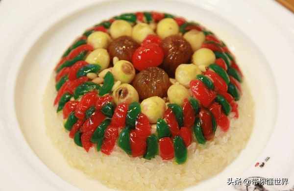 “八寶果飯”以紅棗、蓮子、桂圓、青豆、橘餅、紅瓜、冬瓜糖、葡萄幹等八樣果品。吃一口香甜軟糯的八寶飯,具有團團圓圓,甜甜蜜蜜的象征,是過年飯桌上最常見的甜食。